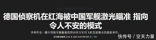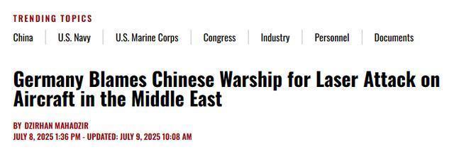美国海军学会网站7月8日称,德国外交部当天表示,中国海军使用激光武器照射了一架德国飞机,后者隶属于欧盟在红海护航行动,旨在保护国际航运免受也门胡塞武装的袭击。