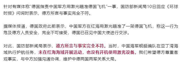 尽管德国官方在相关声明中没有“点名”具体是哪艘中国军舰,但德国《明镜周刊》说法是,德国飞机是在“在例行任务飞行中”接近一艘中国护卫舰时,该护卫舰“在没有理由或事先通信的情况下对飞机进行了激光瞄准”,导致该机被迫中止任务并返回吉布提。