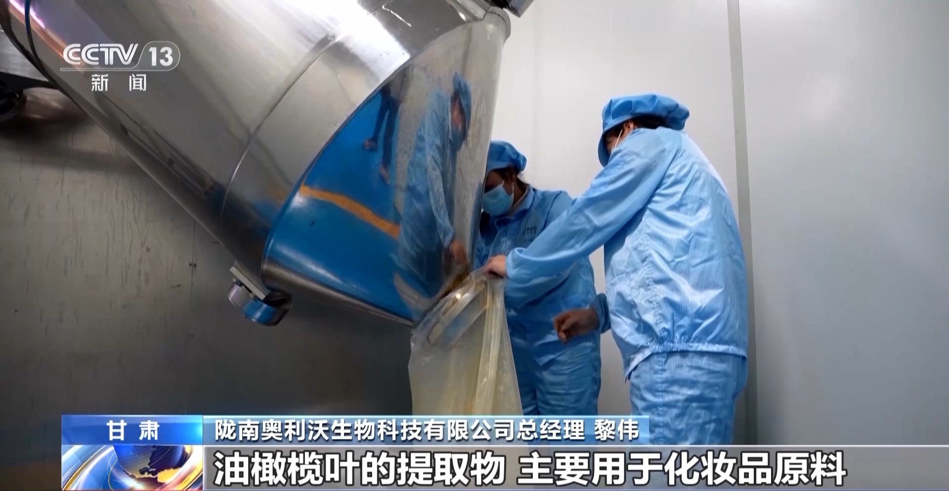 陇南奥利沃生物科技有限公司总经理 黎伟:油橄榄叶的提取物主要用于化妆品原料;油橄榄果渣主要是提取山楂酸,用于饲料添加,提取完之后所有的废渣,我们会做成生物质颗粒;果核分出来之后能做成高端活性炭。在副产物方面,我们综合利用率能达到70%。