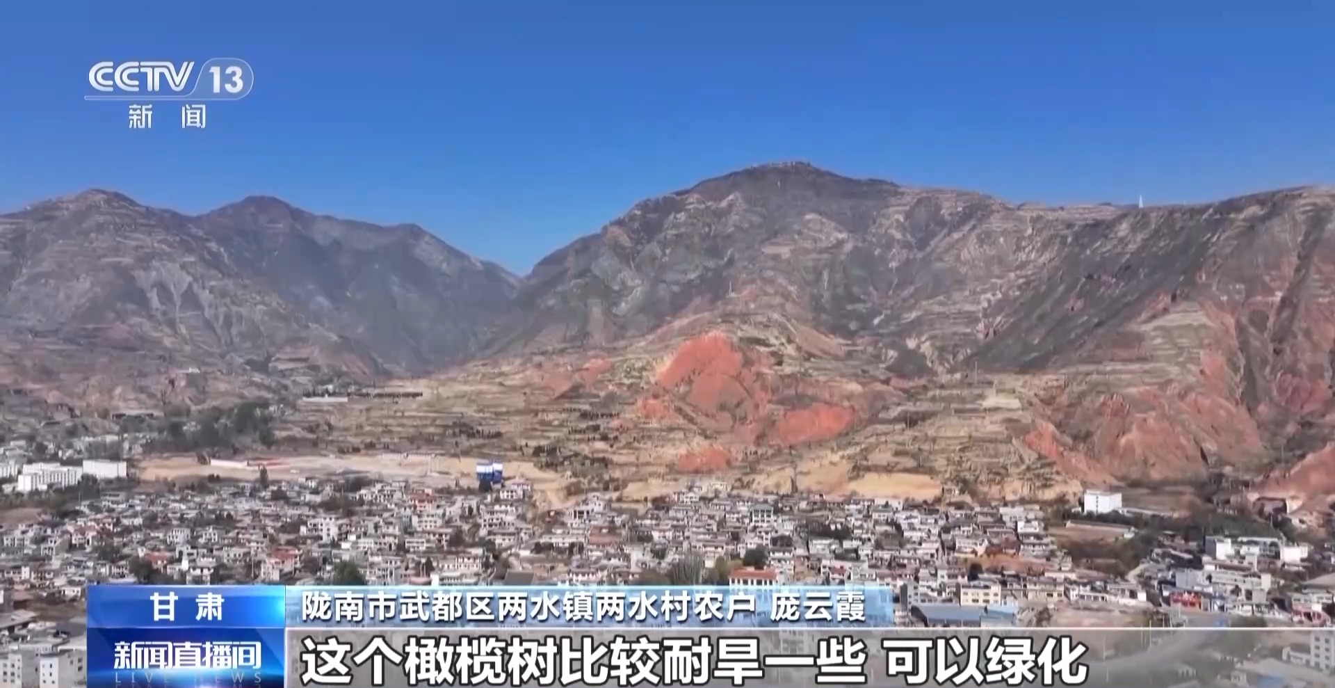陇南市武都区两水镇两水村农户 庞云霞:以前我们这边的山都是光秃秃的,这个橄榄树比较耐旱,可以绿化。我们现在线下线上都在卖,销售的渠道也更多了,通过橄榄树来致富,让日子过得更加红火。