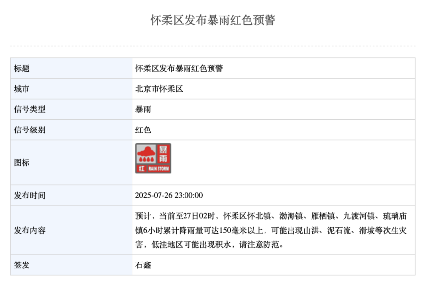 7月26日23时,怀柔区发布暴雨红色预警信号: